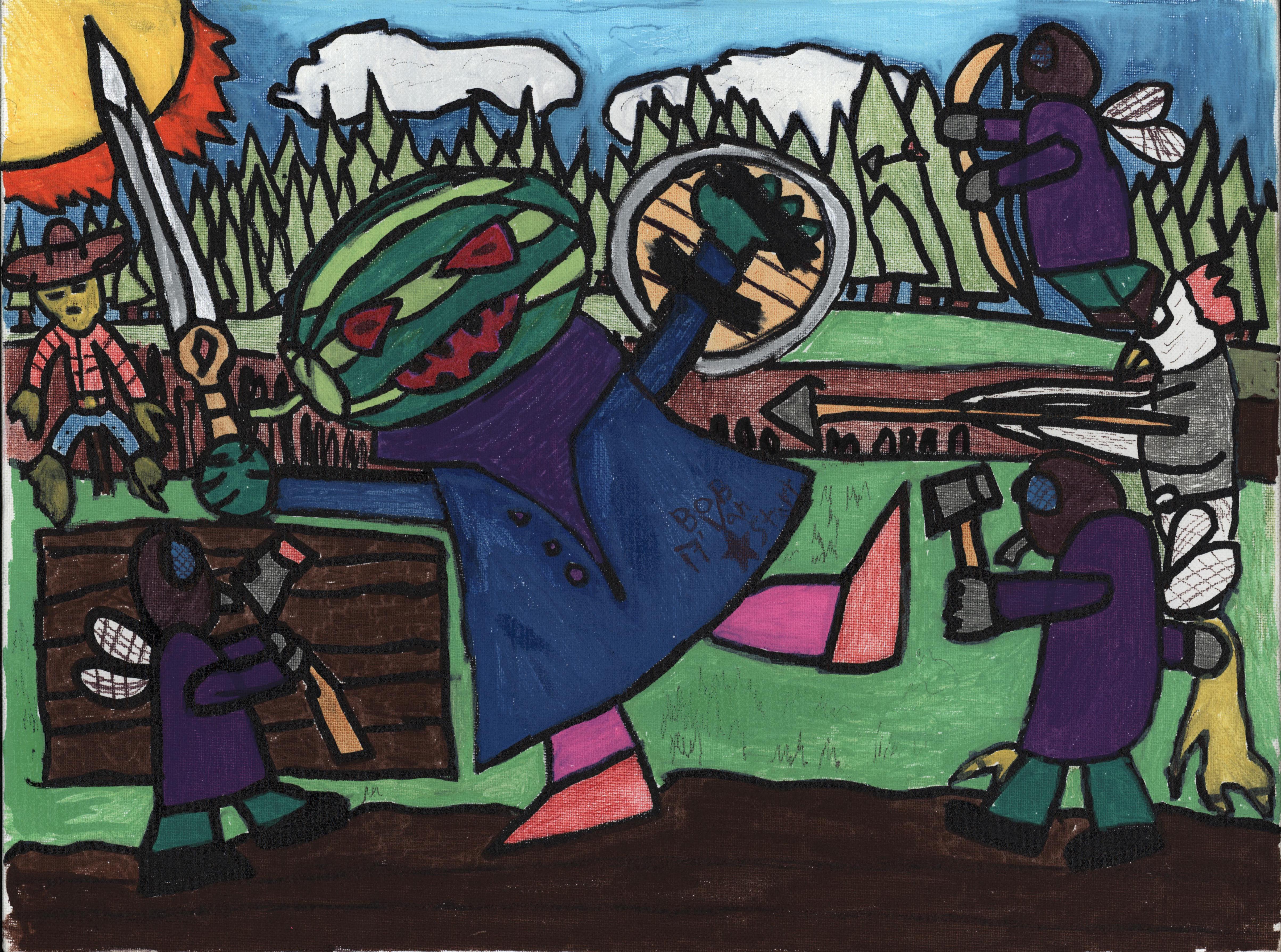 “TheWatermelonMan” was another painting I did on a flat canvas with oil paint. I really like the way this one turned out. You really got to defend yourself from the elements when you are a tasty watermelon in the summer.